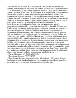 El discurso trata sobre la drogadicción en los jóvenes y busca concientizar a la sociedad sobre este problema. Explica que la drogadicción es una enfermedad que daña la salud y aleja a las personas de la sociedad, convirtiendo la droga en el centro de su vida. Identifica las principales causas como la inestabilidad emocional en la adolescencia, las influencias sociales y la mayor disponibilidad de drogas. El objetivo es que todos colaboren para acabar con este problema que afecta a los jóvenes y tiene consecuencias