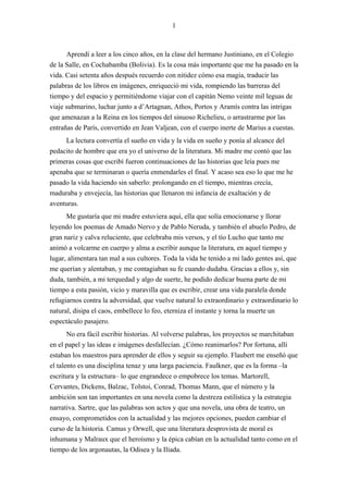 Vargas Llosa habla sobre el impacto que tuvo el aprender a leer a los 5 años y cómo la lectura le permitió viajar a mundos de ficción. También expresa su agradecimiento a familiares y maestros que lo alentaron a dedicarse a la escritura. Finalmente, destaca el papel de la literatura para crear empatía entre personas de diferentes culturas y
