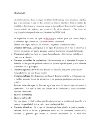 Un discurso tiene el propósito de informar o comunicar a un público para obtener su aprobación mediante la persuasión. Existen varios tipos de discursos como los narrativos, descriptivos, expositivos, argumentativos y dialogales. También están los discursos espontáneos y elaborados, así como los discursos históricos, científicos, literarios, periodísticos, jurídicos y didácticos, los cuales se enfocan en diferentes temas y áreas de especialización.