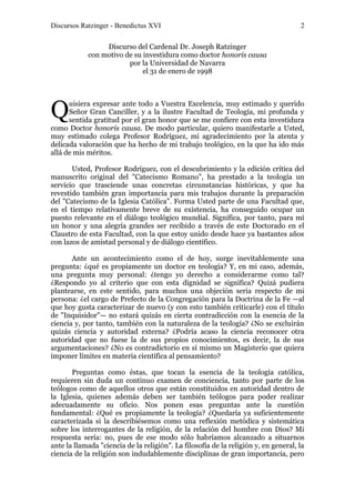 Este documento contiene el discurso del Cardenal Joseph Ratzinger con motivo de recibir un doctorado honoris causa por la Universidad de Navarra en 1998. En el discurso, Ratzinger explora la naturaleza de la teología y su relación con la autoridad y la ciencia. Argumenta que la teología se basa en una Palabra dada que guía el pensamiento más allá de sus propias limitaciones, y que esta Palabra es la Escritura viviente en la Iglesia a través de la interpretación y tradición.