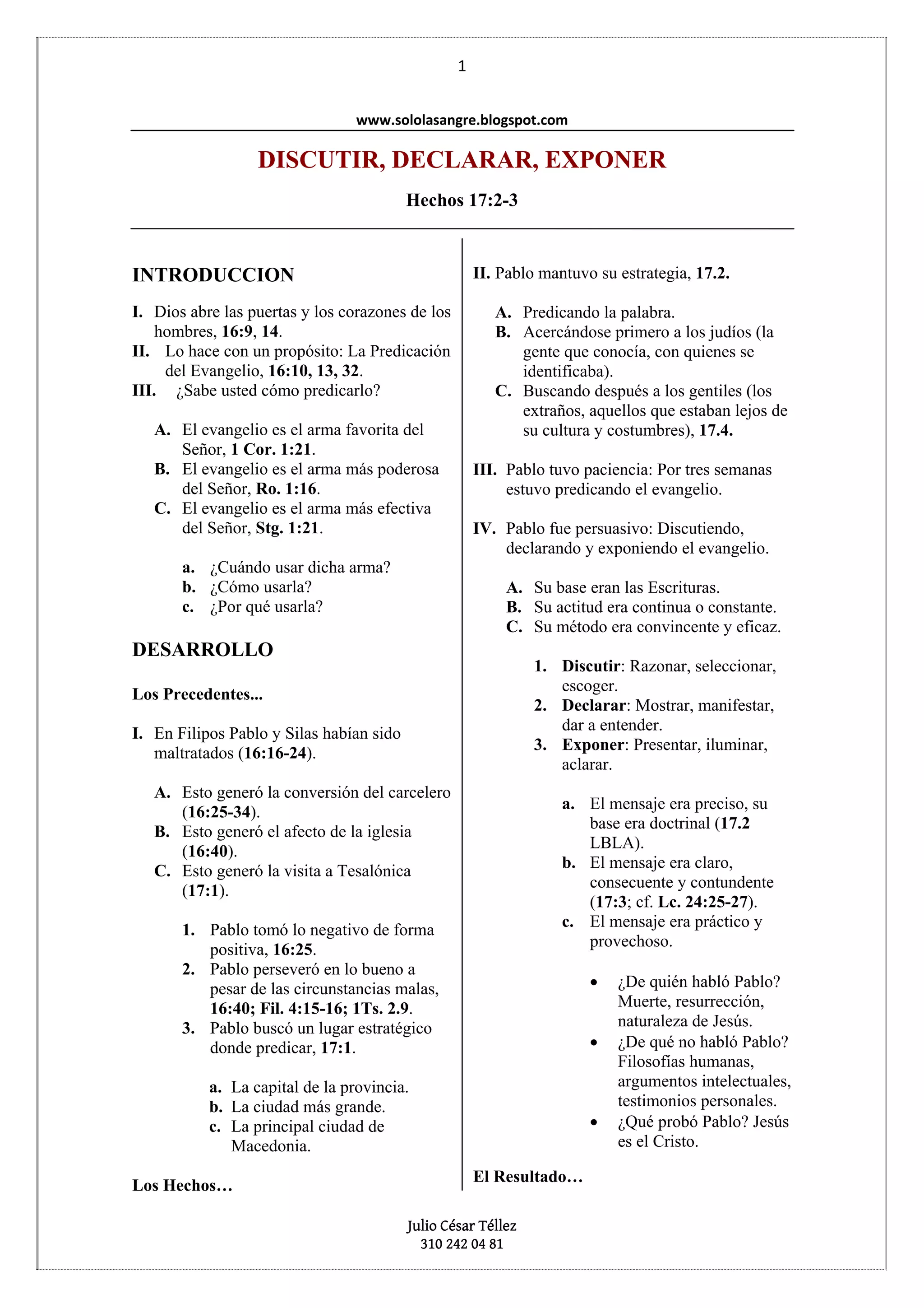 El documento describe la estrategia de Pablo para predicar el evangelio, enfatizando su enfoque en razonar y exponer las escrituras de manera persuasiva. A través de su perseverancia y métodos convincentes, Pablo logró convertir a judíos y gentiles, enfrentándose a la oposición y persecución religiosa. Se concluye que predicar el evangelio requiere dedicación, competencia, sabiduría y prudencia en diversas circunstancias.