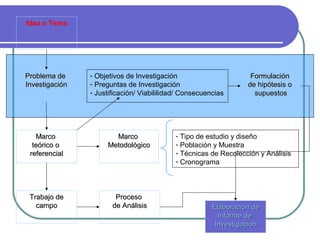 Este documento presenta una guía para elaborar un proyecto de investigación. Explica los componentes clave que debe contener un proyecto como la portada, índice, planteamiento del problema, objetivos, marco teórico, metodología, cronograma y referencias. Destaca la importancia de definir claramente el problema de investigación, formular hipótesis, especificar las variables, la población, los instrumentos y el análisis de datos. Además, enfatiza que todos los componentes del proyecto deben ser congruentes entre sí.
