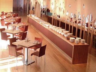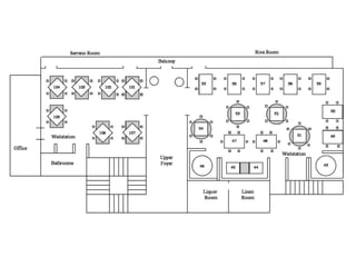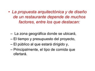 El documento habla sobre los factores clave a considerar en el diseño de establecimientos de alimentos y bebidas, incluyendo la ubicación, el público objetivo, el tipo de comida y la creación de un concepto que ofrezca identidad pero no compita con la propuesta gastronómica. También discute el diseño del área de servicio, la distribución de espacios y equipos, y los aspectos a considerar en la decoración, iluminación, mobiliario y otros elementos para brindar una buena experiencia al cliente.