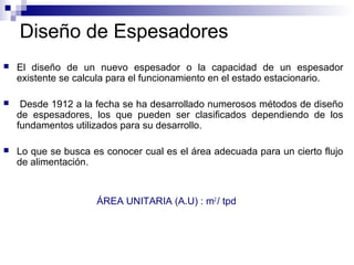 El documento describe varios métodos para diseñar espesadores, incluyendo los métodos de Mishler, Coe-Clevenger y Talmage-Fitch. Estos métodos utilizan balances de masa y la teoría de sedimentación de Kynch para calcular el área necesaria de un espesador dado un flujo de alimentación y concentraciones de entrada y salida deseadas. El documento también presenta ejemplos numéricos para ilustrar los cálculos involucrados en cada método.