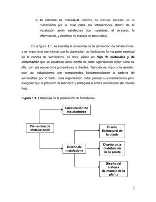 El documento habla sobre la planeación e importancia del diseño de instalaciones. Define la planeación como establecer cómo los activos fijos apoyarán los objetivos de una actividad. Explica que la planeación incluye la localización y el diseño de componentes. Luego describe el proceso de planeación de instalaciones en 6 pasos: 1) definir el problema, 2) analizarlo, 3) determinar requerimientos de espacio, 4) evaluar alternativas, 5) seleccionar un plan, 6) implementarlo. Finalmente enfatiza que un buen