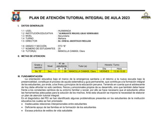 El plan de atención tutorial integral de aula 2023 de la institución educativa 'Almirante Miguel Grau Seminario' busca fortalecer la convivencia y el acompañamiento de estudiantes y familias a través de estrategias de tutoría grupal e individual. Se enfoca en promover estilos de vida saludable, prevención de conductas de riesgo y la mejora de relaciones interpersonales en un entorno educativo inclusivo y seguro. Además, incluye actividades de reflexión y participación comunitaria para abordar problemáticas específicas y fomentar el desarrollo integral de los estudiantes.
