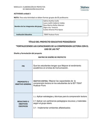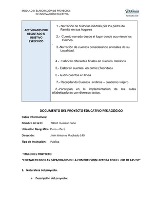 Este proyecto educativo tiene como objetivo mejorar las capacidades de comprensión lectora en estudiantes aplicando estrategias con el uso de las TIC. Se implementarán 8 actividades como narrar cuentos usando dispositivos móviles, elaborar comics digitales, crear audio cuentos en línea y establecer un aula alfabetizadora. El proyecto es llevado a cabo por un grupo de 5 profesores y cuenta con la participación de padres y estudiantes de la Institución Educativa Primaria N° 70047 Huáscar en Puno