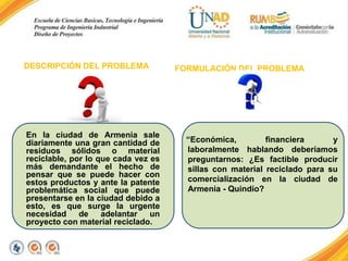 Este documento presenta un estudio de factibilidad para la fabricación de sillas plásticas utilizando material reciclado en Armenia, Quindío. El estudio concluye que el proyecto es viable económica y financieramente dado que los costos de producción son menores a los ingresos proyectados, se identificaron clientes potenciales en el mercado local, y existe una alta aceptación del producto. Adicionalmente, el proyecto beneficiaría el medio ambiente y generaría empleo en la región.
