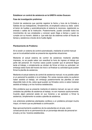 El documento presenta un proyecto para establecer un sistema de control de asistencia automatizado en la Universidad Nacional Experimental de la Fuerzas Armada (UNEFA) en Guacara, Venezuela. El sistema propuesto utilizaría lectores de huellas digitales para registrar la hora de entrada y salida del personal, reemplazando el actual sistema manual. Esto permitiría un mejor control de la asistencia y el cumplimiento de horarios. Se detallan las fases del proyecto y los beneficios del nuevo sistema.