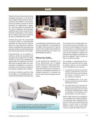 El documento discute el uso de aglomerado (MDF) para estructuras de sofás en lugar de madera maciza tradicional. El MDF ofrece ventajas como superficies planas para terminados, resistencia y facilidad de limpieza. El autor propone un diseño de sofá con estructura de MDF y cortes de detalle computarizados, inspirándose en cerámicas y sellos precolombinos para lograr una estética colombiana.