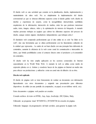 Este documento describe el diseño web, que consiste en la planificación, diseño, implementación y mantenimiento de sitios web. Explica que el diseño web involucra aspectos como el diseño gráfico, interfaz de usuario, interacción multimedia, estructura de la información y optimización para motores de búsqueda. También cubre las etapas del diseño web como el diseño visual, estructura jerárquica y posicionamiento SEO, así como consideraciones de accesibilidad, historia y evolución del HTML.
