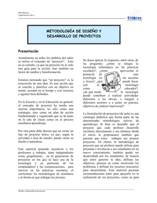 Este documento presenta una metodología para el diseño y desarrollo de proyectos educativos que integren tecnología. Explica que los proyectos son estrategias didácticas que permiten innovar en las prácticas escolares. Recomienda que los profesores generen proyectos que involucren a los estudiantes y les permitan trabajar en sus propios proyectos. También describe las ventajas de los proyectos, como permitir que los estudiantes aprendan resolviendo problemas significativos para ellos de manera integrada