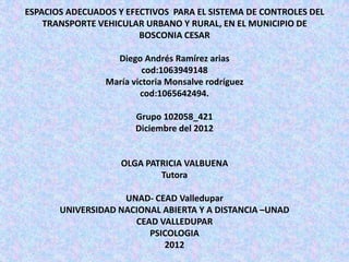 El documento analiza la necesidad de establecer un sistema de control efectivo para el transporte vehicular urbano y rural en Bosconia, Cesar, dado el aumento de inseguridad y la falta de organización en las empresas de transporte. Propone la creación de una base de datos para la verificación de documentación de conductores y vehículos, y resalta la importancia de mejorar la calidad de vida y satisfacer las necesidades básicas de los habitantes mediante un transporte adecuado. A través de un diseño metodológico descriptivo-explicativo, el estudio busca identificar factores que afectan la calidad de vida y proponer soluciones para optimizar el transporte en la región.