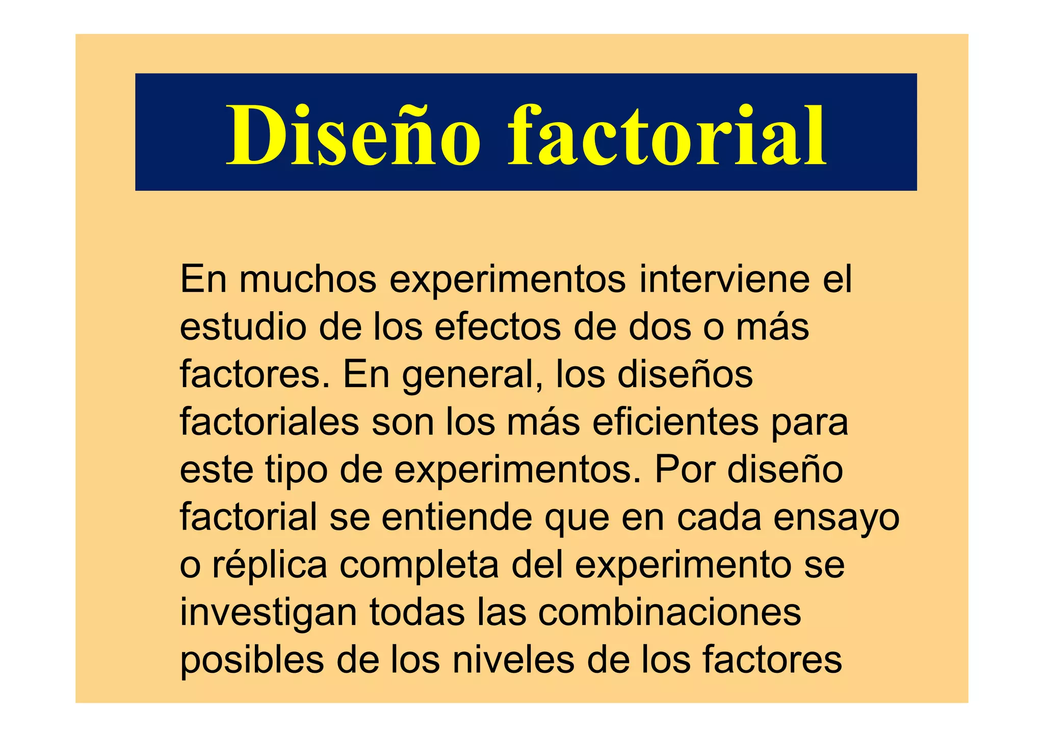Este documento describe los diseños factoriales, los cuales permiten estudiar los efectos de dos o más factores en un experimento. Explica que en los diseños factoriales se investigan todas las combinaciones posibles de los niveles de los factores. Luego clasifica los diseños factoriales según la cantidad de niveles por factor, la cantidad de combinaciones de tratamientos realizadas, y el grado de control de variables extrañas. Finalmente, presenta un ejemplo de un diseño factorial 2x2 completamente al azar y su análisis de varianza correspondiente.