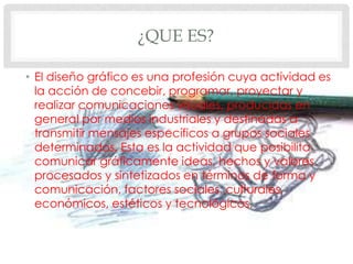 El diseño gráfico es una profesión que concibe y crea comunicaciones visuales para transmitir mensajes a grupos específicos. Incluye diseño publicitario, editorial, de identidad corporativa, web, envases y más. Si bien tiene orígenes antiguos, se define como profesión más recientemente. Actualmente, los diseñadores usan herramientas digitales y computadoras son esenciales, aunque los principios del diseño no han cambiado.