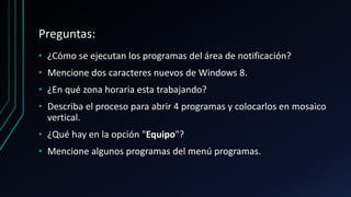 Este documento contiene preguntas y respuestas sobre el uso de Windows 8. Algunas preguntas tratan sobre características nuevas como la pantalla de bloqueo y el menú de inicio metro. Otras preguntas tratan sobre cómo abrir y organizar programas en mosaico vertical u horizontal, y cómo minimizar y cerrar ventanas. El documento también describe opciones como el equipo, la papelera de reciclaje y el entorno de red.