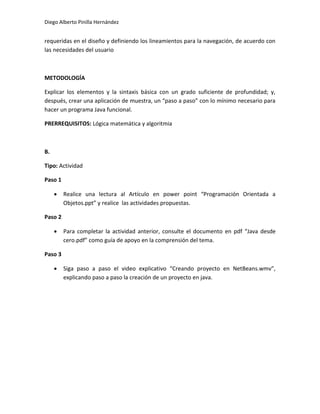 Este documento presenta una introducción al lenguaje de programación Java. Java es un lenguaje orientado a objetos desarrollado por Sun Microsystems en los años 90 que toma su sintaxis de C y C++ pero tiene un modelo de objetos más simple. Las aplicaciones Java se compilan típicamente en bytecode que es luego interpretado o compilado a código nativo para ejecución. El objetivo del aprendizaje descrito es transmitir los fundamentos de la programación en Java enfocada en el paradigma de programación orientada a objetos.