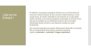 El documento trata sobre los stands expositivos y su función comunicativa. Explica que los stands son espacios efímeros para comunicar un producto o empresa y vender. Su objetivo principal es transmitir un mensaje a través de su diseño y contenido. El diseñador se encarga de planificar el proyecto considerando factores como el mensaje a transmitir, el público objetivo y los materiales utilizados.