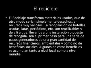 El documento describe los pasos y beneficios del proceso de reciclaje. Explica que los materiales reciclables se recogen, clasifican y procesan para convertirlos en materias primas y nuevos productos. Luego, los productos reciclados se fabrican y compran, cerrando así el ciclo del reciclaje. El reciclaje protege el medio ambiente, ahorra recursos y energía, y genera empleos y beneficios económicos tanto a nivel local como global.