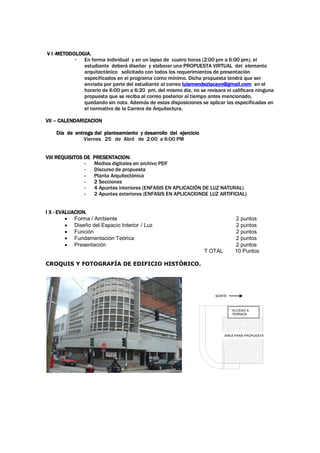 Este documento presenta un proyecto para diseñar un café terraza jardín sobre un edificio histórico. Los estudiantes deben desarrollar una propuesta formal interior y exterior que incorpore conceptos de luz natural y artificial, y que ofrezca espacios de descanso y esparcimiento para los usuarios. La propuesta debe contrastar con el edificio histórico mediante el uso de materiales y formas vanguardistas. Los estudiantes deben fundamentar teóricamente y graficar su propuesta en un PDF para su entrega antes del 25 de ab