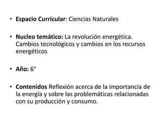 El documento trata sobre un plan de estudios de ciencias naturales para sexto grado. El núcleo temático es la revolución energética, incluyendo cambios tecnológicos y recursos energéticos. Los contenidos se enfocan en reflexionar sobre la importancia de la energía y los problemas relacionados con su producción y consumo.