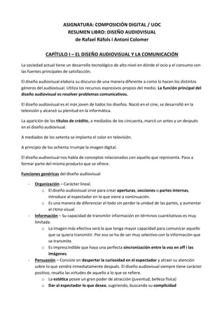 El documento resume el primer capítulo de un libro sobre diseño audiovisual. Explica que el diseño audiovisual usa recursos visuales y de sonido para resolver problemas de comunicación. Su función principal es organizar la información de manera lineal y transmitirla de forma efectiva. También puede usarse para persuadir o simbolizar conceptos abstractos a través de imágenes y sonidos. El diseño audiovisual se compone de signos visuales, auditivos y verbales que deben estar bien articulados para transmitir coherentemente el mensaje.
