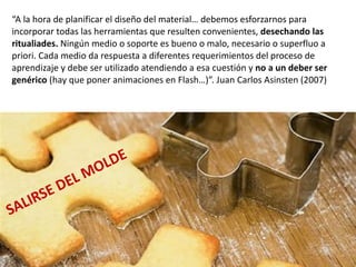 Este documento describe el proceso de creación de contenidos digitales educativos. Señala que 1) la planificación y diseño conceptual es fundamental, 2) los contenidos digitales deben formar parte de un conjunto coherente desde el inicio del proyecto, y 3) herramientas como procesadores de texto, editores de imágenes y video, y programas de presentaciones son esenciales, aunque se deben seleccionar en función del diseño pedagógico.