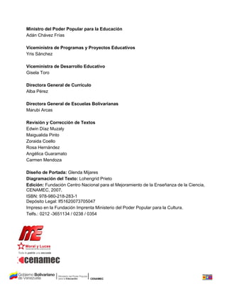 Este documento presenta el currículo del Subsistema de Educación Primaria Bolivariana de Venezuela. Establece las características, objetivos y perfil del egresado de la educación primaria, así como los ejes integradores y áreas de aprendizaje por grado. El currículo se basa en los ideales de libertad e igualdad de pensadores venezolanos como Simón Bolívar y busca formar ciudadanos comprometidos con su país y capaces de participar en la sociedad.