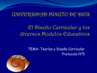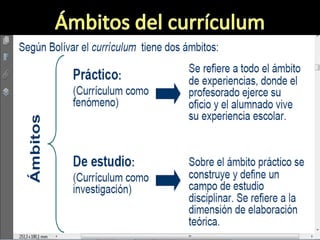 Este documento define el currículo y explica sus diferentes clasificaciones y conceptos. Explica que el currículo incluye los contenidos de enseñanza y el plan de actividades escolares. También describe los modelos educativos, el diseño curricular, los elementos de un plan de estudios y las etapas para elaborar un plan de estudios. En general, el documento provee una introducción completa sobre los fundamentos teóricos del currículo y su diseño e implementación en el sistema educativo.