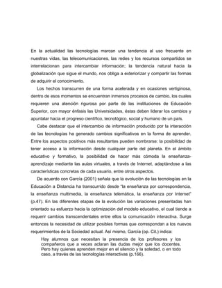 Este documento describe el diseño de un curso en línea para la enseñanza del subproyecto de Base de Datos dirigido a estudiantes de Informática de la UNELLEZ Apure. El curso se desarrollará en una plataforma de educación a distancia para facilitar el acceso de los estudiantes al material desde cualquier lugar y mejorar el proceso de enseñanza-aprendizaje a través de las TIC. El autor revisa trabajos previos relacionados con el uso de la tecnología en la educación a distancia.