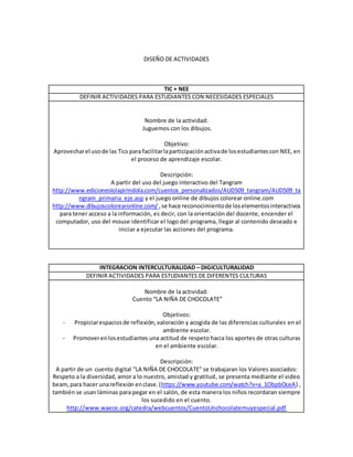 El documento propone dos actividades para estudiantes con necesidades especiales y de diferentes culturas usando las TIC. La primera actividad usa juegos interactivos online como Tangram y dibujos para colorear para facilitar la participación de estudiantes con NEE en el aprendizaje. La segunda actividad presenta el cuento "La niña de chocolate" mediante video para promover el respeto a la diversidad cultural y los aportes de otras culturas.