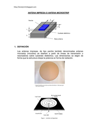 Las antenas microstrip, también conocidas como antenas impresas, consisten en un parche conductor sobre un sustrato dieléctrico. Se pueden diseñar para trabajar a diferentes frecuencias y con distintas polarizaciones. Presentan ventajas como su bajo perfil, bajo costo y facilidad de fabricación, pero también desventajas como su baja ganancia, limitada potencia y estrecho ancho de banda. El documento describe el diseño y simulación de una antena microstrip circular para recepción ISDB-T.