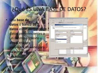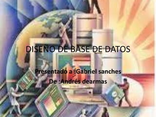 Este documento presenta información sobre el diseño de bases de datos. Explica que una base de datos es un conjunto de datos almacenados sistemáticamente para su uso posterior. Recomienda crear bases de datos especializadas para cada tipo de aplicación en lugar de usar bases de datos generales para todos los propósitos. También describe algunas estrategias económicas para crear bases de datos en línea, como usar sitios web propios o crear micrositios para captar datos. Finalmente, presenta una lista de las 10 bases de datos más grandes del mundo.