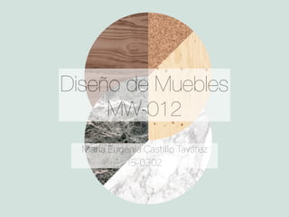 El documento presenta el diseño de muebles realizado por María Eugenia Castillo Tavárez para su clase de Diseño de Interiores. Incluye plantas dimensionadas, perspectivas y elevaciones de un mueble de dormitorio creado en Vectorworks, así como fotos que sirvieron de inspiración y fotomontajes del mueble en una habitación. El trabajo fue realizado para la profesora Magaly Caba el 22 de septiembre de 2016.