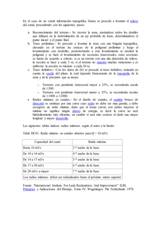 El documento describe los elementos básicos del diseño de canales de riego, incluyendo la determinación del trazo, secciones transversales, pendientes y velocidades. Explica que el diseñador debe considerar factores como el caudal de diseño, tipo de suelo, cultivo y clima para definir el trazo más eficiente. Además, detalla los tipos de canales según su orden y las ecuaciones comúnmente usadas para calcular la sección hidráulica óptima.
