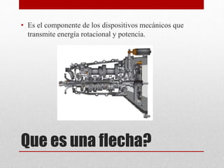 El documento habla sobre el diseño de flechas o ejes. Explica que una flecha transmite energía rotacional y potencia en máquinas como reductores de velocidad, bombas y ventiladores. Detalla las fuerzas que actúan en un eje como torsión, fuerzas transversales y axiales. Además, presenta el procedimiento para diseñar un eje, que incluye determinar la velocidad, potencia, material, diámetro y dimensiones finales considerando puntos críticos y concentradores de esfuerzo.