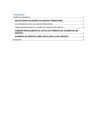 Este documento proporciona instrucciones para cambiar el diseño y formato de gráficos en Microsoft Excel. Explica cómo aplicar diseños y estilos predefinidos a gráficos, cambiar manualmente el diseño de elementos de gráfico como etiquetas y ejes, cambiar el formato de elementos individuales, y guardar gráficos como plantillas para su reutilización.