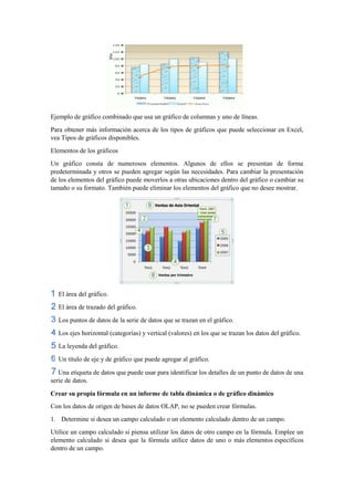 Este documento describe cómo crear gráficos y fórmulas en Excel y cómo imprimir hojas de cálculo. Explica que los gráficos se usan para presentar datos numéricos de forma gráfica y que Excel ofrece varios tipos de gráficos. También cubre cómo crear fórmulas personalizadas en informes dinámicos y cómo configurar opciones de impresión como la impresora y orientación al imprimir hojas de cálculo.