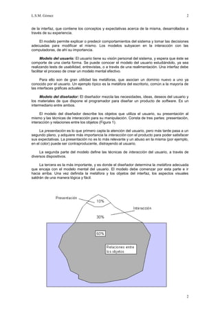 El documento describe los principios fundamentales del diseño de interfaces de usuario, incluyendo el uso de prototipos y heurísticas de evaluación. Explica conceptos como los modelos mentales del usuario, diseñador y programador, y principios como la anticipación, autonomía, percepción del color, valores predeterminados y consistencia. También cubre temas como la eficiencia del usuario, la ley de Fitts y las interfaces explorables, con el objetivo de crear interfaces intuitivas y fáciles de usar.