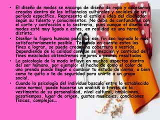 El documento describe los tres tipos principales de moda: alta costura, lista para llevar y mercado de masa. La alta costura se caracteriza por ser hecha a la medida para clientes individuales con materiales y técnicas de alta calidad. La moda lista para llevar se produce en pequeñas cantidades con atención a los detalles. El mercado de masa produce ropa en grandes cantidades y tamaños estándar con materiales baratos para hacerla accesible a una amplia gama de clientes.
