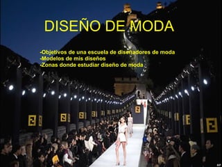 El documento habla sobre los objetivos de una escuela de diseñadores de moda, incluyendo fomentar la creatividad, formar diseñadores con una base teórica y práctica sólida, y conocimientos de la industria de la confección. También menciona algunas zonas en España donde se puede estudiar diseño de moda, como la ESI en Valladolid, INEDI, GOYMAR, y universidades como la de Vigo.