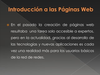El documento habla sobre los fundamentos de las páginas web, incluyendo el lenguaje HTML, el protocolo HTTP, herramientas para diseñar páginas web como Dreamweaver y problemas comunes como el uso excesivo de pop-ups o formularios largos y complejos.