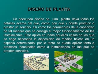 Este documento describe los diferentes aspectos del diseño de plantas industriales, incluyendo la localización, distribución y factores a considerar. Explica que un buen diseño de planta requiere analizar factores económicos, sociales, tecnológicos y de mercado para ubicar la planta de manera óptima. También describe los objetivos de la distribución de planta como aprovechar el espacio, minimizar costos y mejorar la productividad y seguridad. Finalmente, resume los diferentes tipos de distribución como por producción, proceso