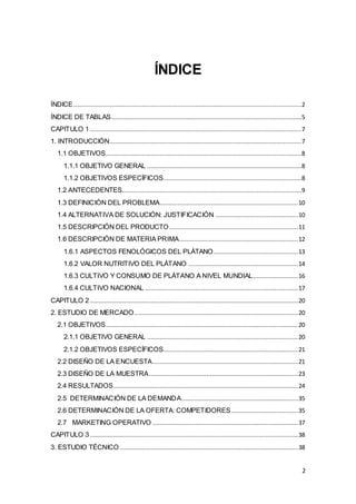 Este documento presenta un estudio de pre-factibilidad para un proyecto de inversión de una planta procesadora de chifles a base de plátano verde. El estudio incluye un análisis de mercado, un estudio técnico del proceso productivo, aspectos legales y organizacionales de la empresa, una evaluación ambiental y un análisis económico-financiero. Los resultados del estudio muestran que el proyecto es técnica y económicamente viable para satisfacer la demanda de chifles en la zona, cumpliendo