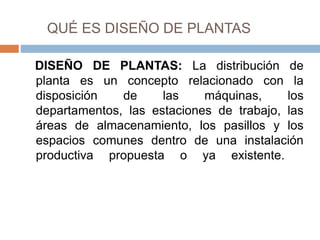 Este documento trata sobre el diseño de plantas industriales. Explica que el diseño de plantas se refiere a la disposición de maquinaria, departamentos, áreas de almacenamiento y otros elementos dentro de una instalación de producción. El objetivo principal del diseño de plantas es organizar estos elementos para garantizar la fluidez del flujo de trabajo, materiales, personas e información a través del sistema de producción. También describe algunos beneficios de un buen diseño de plantas como la reducción de costos, aumento de la productividad y la segur