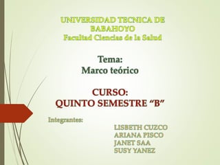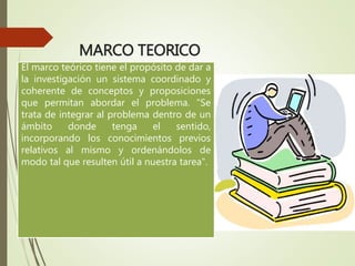El documento describe el marco teórico como un sistema coordinado de conceptos y proposiciones que permite abordar un problema de investigación. Explica que el marco teórico integra el problema dentro de un contexto y ordena los conocimientos previos para ser útiles. También detalla las principales funciones del marco teórico como recopilar información de fuentes primarias, secundarias y terciarias para respaldar la investigación.