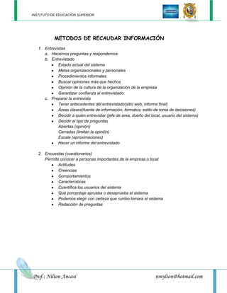El documento describe diferentes métodos para recaudar información como entrevistas y encuestas. Explica que las entrevistas involucran hacer preguntas al entrevistado sobre temas como el estado actual del sistema, metas y procedimientos. También describe cómo preparar y realizar las entrevistas. Las encuestas permiten conocer las actitudes y opiniones de las personas mediante cuestionarios.