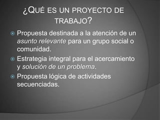Este documento proporciona información sobre lo que constituye un proyecto de trabajo y sus elementos esenciales. Explica que un proyecto de trabajo debe ser una propuesta lógica de actividades secuenciadas para atender un asunto relevante o problema social, considerando recursos, tiempo e infraestructura disponibles. También debe anticipar y guiar el camino hacia un escenario deseable y estar fundamentado en las prioridades y lineamientos institucionales.