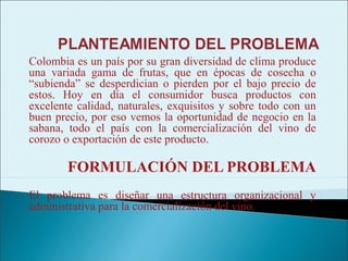 El proyecto propone crear una empresa para la comercialización y producción de vino de corozo en la región de Sucre, Colombia. Se realizarán estudios de mercado, técnicos, financieros y administrativos para determinar la viabilidad y establecer la estructura organizacional requerida. De ser viable, la empresa produciría inicialmente 5,000 botellas de vino de corozo por año para satisfacer la demanda.