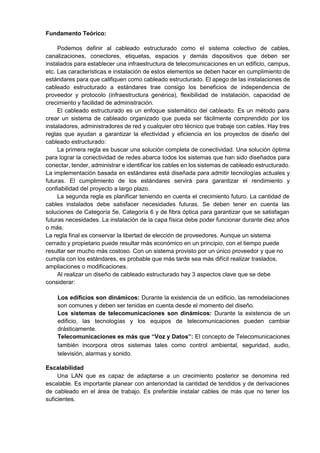 Este documento presenta información sobre el diseño de redes de cableado estructurado. Describe los conceptos clave como cableado estructurado, escalabilidad y estándares relevantes como ANSI/TIA-568-C. Explica los tres aspectos clave a considerar en el diseño: la naturaleza dinámica de los edificios y sistemas de telecomunicaciones, y que las telecomunicaciones abarcan más que voz y datos.
